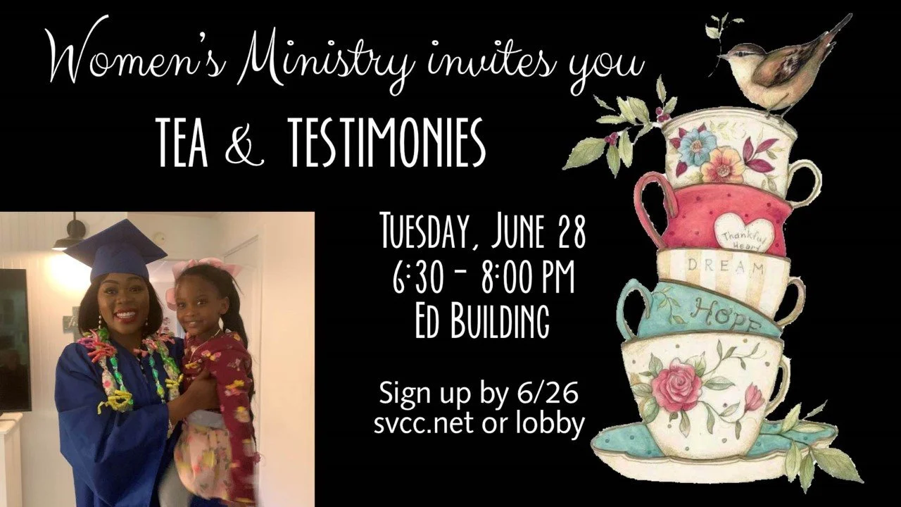 You are invited to the SVCC Women's Ministry upcoming event on Tuesday evening, June 28th at 6:30pm in the Ed Building, We will hear our sister in Christ from Africa, Margret, share her testimony and also hear from the team of ladies who surround Margret. We'll share in some refreshments as well!